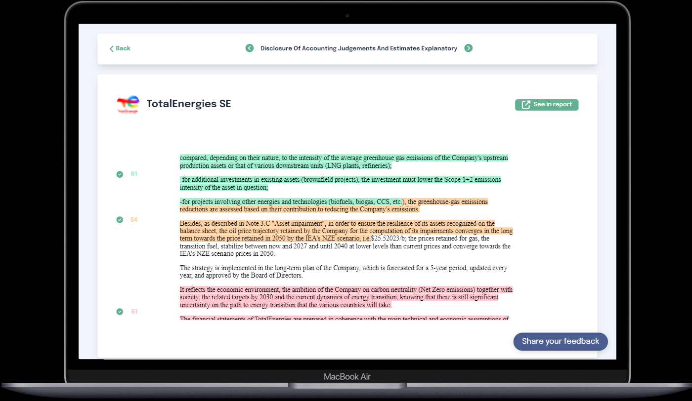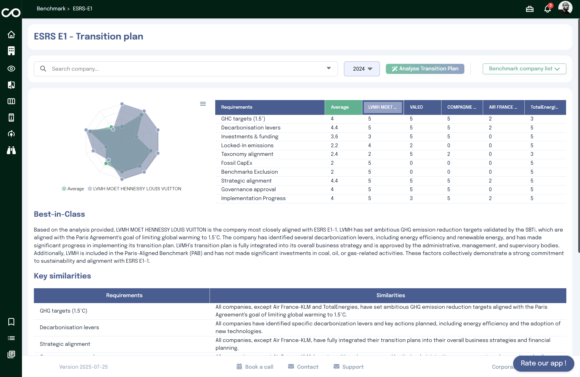 - A new benchmark dedicated to the transition plan, enabling the assessment of disclosure quality against regulatory requirements (ESRS E1-1).