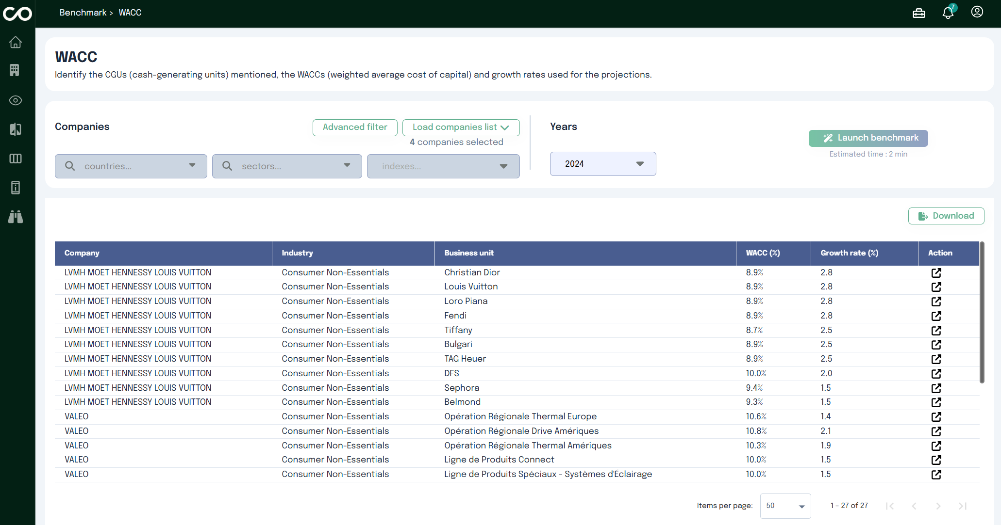 - WACC benchmark is now available, helping you easily identify CGUs mentioned, retrieve WACCs and growth rates used for the projections.