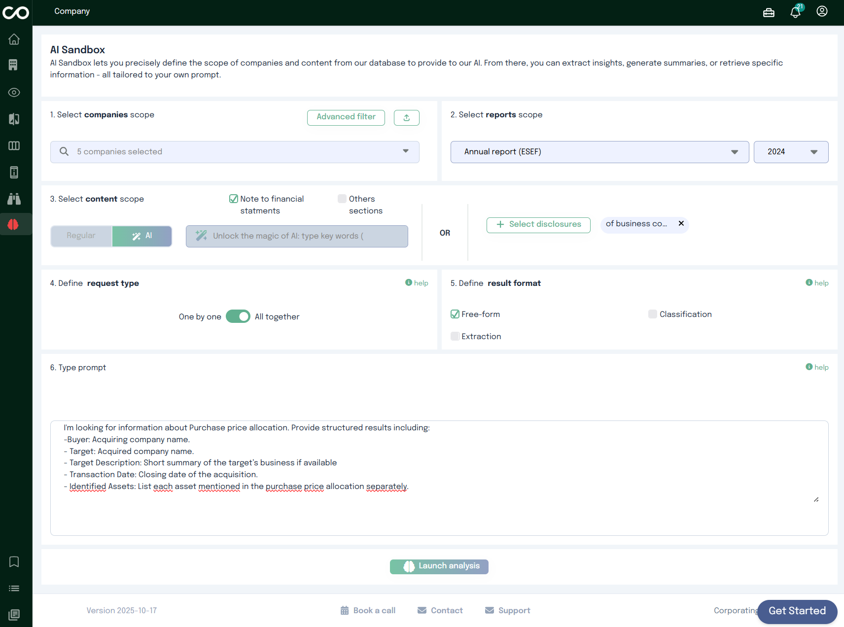 - AI Sandbox lets you precisely define the scope of companies and content from our database to provide to our AI. From there, you can extract insights, generate summaries, or retrieve specific information - all tailored to your own prompt.